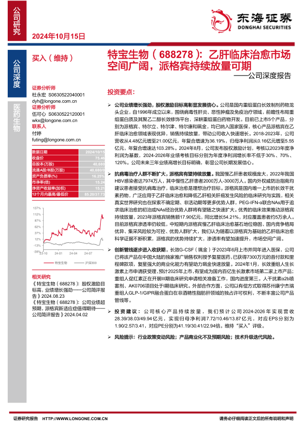 公司业绩增长强劲,股权激励目标高彰显发展信心。公司是国内重组蛋白长效制剂药物龙头企业,自1996年成立以来,围绕病毒性肝炎、恶性肿瘤及免疫治疗领域,前瞻性布局重组蛋白质及其聚乙二醇长效修饰平台,深耕重组蛋白药物开发。目前已上市5个产品,分别为派格宾、特尔立、特尔津、特尔康和珮金,均已纳入国家医保,核心产品派格宾在乙肝临床治愈领域表现优异,销售持续放量,带动公司收入快速增长。2018-2023年,公司营收从4.48亿元增至21.00亿元,年复合增速为36.19%,归母净利润从0.16亿元增至5.55亿元,年复合增速达103.28%。2024年8月,公司发布股权激励计划,考核以2023年度净利润为基数,2024-2026年业绩考核目标分别为年度净利润增长率不低于30%、70%、120%。公司未来三年业绩高增长目标明确,彰显公司长期发展信心。