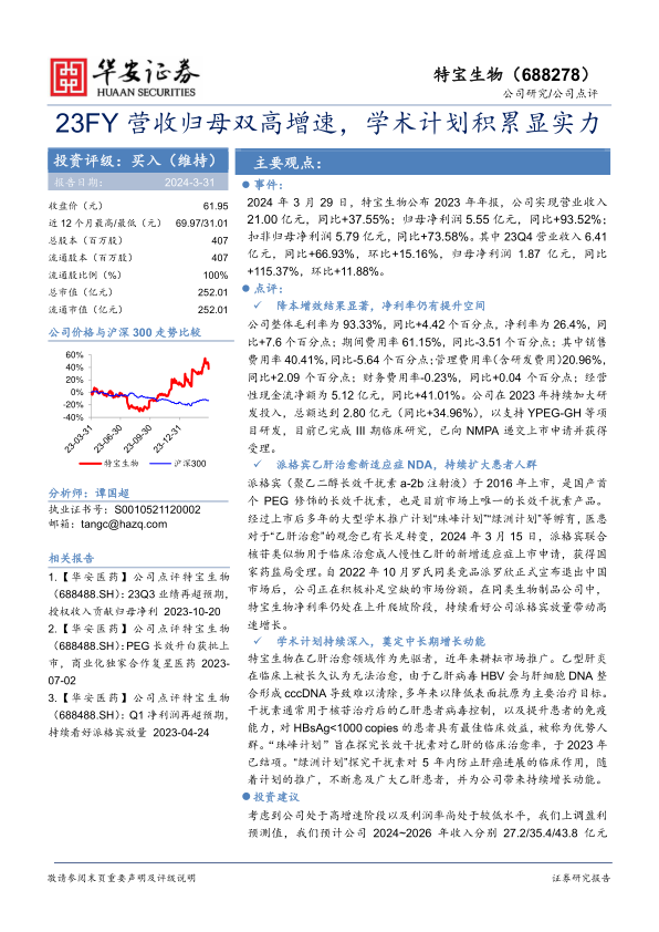 本报告分析了特宝生物2023年的财务业绩和未来发展前景,并维持“买入”评级。