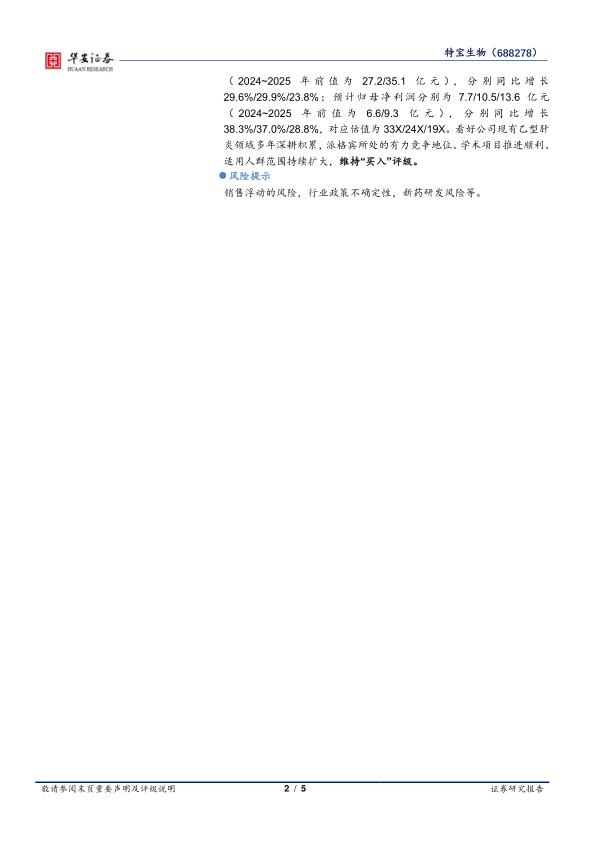 考虑到公司处于高增速阶段以及利润率尚处于较低水平,我们上调盈利预测值,我们预计公司2024~2026年收入分别27.2/35.4/43.8亿元(2024~2025年前值为27.2/35.1亿元),分别同比增长29.6%/29.9%/23.8%;预计归母净利润分别为7.7/10.5/13.6亿元(2024~2025年前值为6.6/9.3亿元),分别同比增长38.3%/37.0%/28.8%,对应估值为33X/24X/19X。看好公司现有乙型肝炎领域多年深耕积累,派格宾所处的有力竞争地位、学术项目推进顺利、适用人群范围持续扩大,维持“买入”评级。