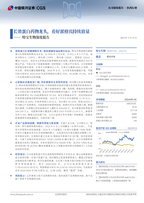 投资建议:公司是重组蛋白类长效制剂药物研发平台型企业,核心品种派格宾是目前国内唯一长效干扰素产品,国内慢性乙肝患者群体庞大,随着乙肝临床治愈理念的不断普及、科学证据的积累,以长效干扰素为基石的组合疗法渗透率有望持续提升。预计2024-2026年,公司归母净利润分别为7.79/10.65/13.80亿元,利润增速分别为40.21%/36.76%/29.59%,当前股价对应2024-2026年PE分别为32、23和18倍,维持“推荐”评级。