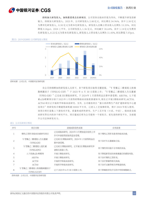 存量产品保持稳健,创新管线进入收获期。存量产品方面,公司特尔立、特尔津、特尔康销售维持稳定;2023年6月上市的珮金(长效升白药),与复星合作销售有望迅速放量;2024年1月益佩生(长效生长激素)NDA受理,长效生长激素具有百亿市场规模的潜力,目前国内仅长春金赛的金赛增上市,竞争格局良好;长效促红素已完成II期临床并准备开启III期,国内进度靠前;与康宁杰瑞合作的KN069(GLP-1/GIPR-Fc融合蛋白)正在开展肥胖和超重适应症的I期临床,未来有望进军百亿NASH市场;ACT50(PEG化αvβ3拮抗剂)和ACT60(糖皮质激素及IL-2类激动剂的联合药物组合)正在临床前研究阶段。
