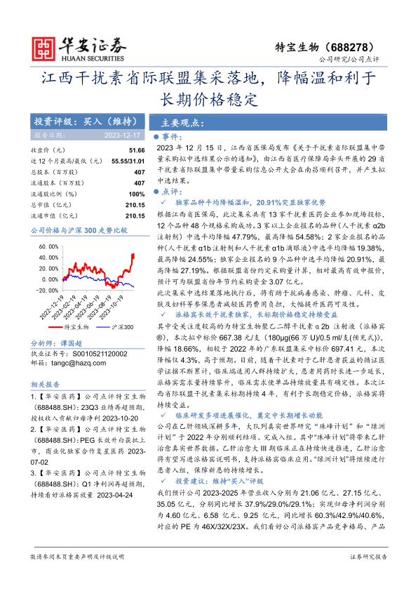 本报告分析了特宝生物在江西省际联盟干扰素集采中的表现,指出其独家品种降幅温和,有利于长期价格稳定。同时,公司在乙肝领域的临床研发进展将为中长期增长提供动能。维持对公司“买入”评级,但需关注销售波动、行业政策不确定性以及新药研发风险。