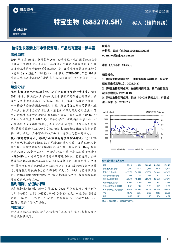 本报告核心观点指出,特宝生物自主研发的长效生长激素注射液(怡培生长激素注射液)获得国家药品监督管理局的上市许可申请受理,标志着公司产品线有望进一步丰富。鉴于国内长效生长激素市场竞争格局良好,目前仅有金赛药业获批上市,怡培生长激素注射液的成功上市将显著提升公司在生物制药领域的整体竞争力,为公司带来新的增长点。