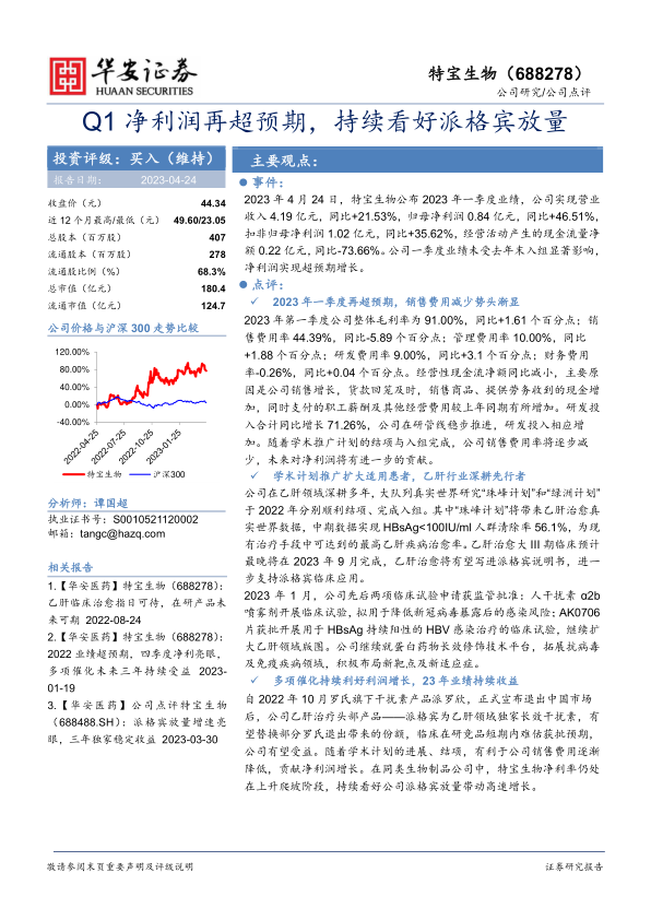 本报告分析了特宝生物2023年一季度业绩,认为公司净利润超预期增长,销售费用减少趋势明显。公司在乙肝领域深耕多年,通过学术推广计划和临床试验,不断扩大市场份额。维持对特宝生物“买入”评级,看好公司未来发展前景。同时,报告也提示了药物审批、新药研发、销售波动和行业政策等风险。