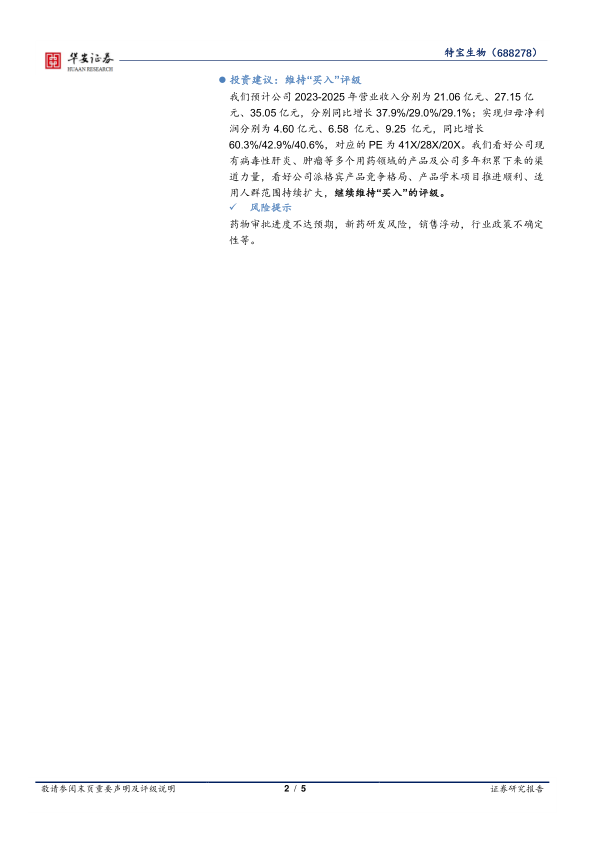 我们预计公司2023-2025年营业收入分别为21.06亿元、27.15亿元、35.05亿元,分别同比增长37.9%/29.0%/29.1%;实现归母净利润分别为4.60亿元、6.58亿元、9.25亿元,同比增长60.3%/42.9%/40.6%,对应的PE为41X/28X/20X。我们看好公司现有病毒性肝炎、肿瘤等多个用药领域的产品及公司多年积累下来的渠道力量,看好公司派格宾产品竞争格局、产品学术项目推进顺利、适用人群范围持续扩大,继续维持“买入”的评级。