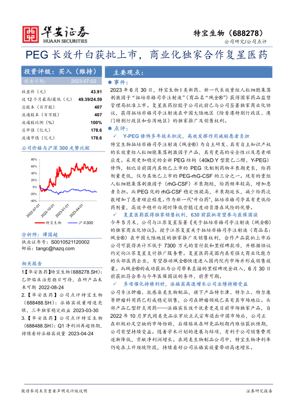 2023年6月30日,特宝生物I类新药、新一代长效重组人粒细胞集落刺激因子“拓培非格司亭注射液”(商品名“珮金®”)获得国家药品监督管理局批准上市。复星医药控股子公司此前已与公司签署独家商业化协议,获得拓培非格司亭注射液在中国大陆地区(除香港特别行政区、澳门特别行政区和台湾地区)的独家推广及销售权利。