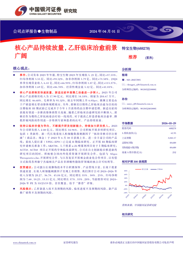 特宝生物凭借其核心产品派格宾的强劲销售表现和持续增长的盈利能力,在2023年取得了卓越的财务业绩。公司在研发方面投入巨大,不仅成功上市了新产品珮金,还在乙肝临床治愈等多个关键领域取得了显著进展,巩固了其在长效干扰素市场的领导地位。展望未来,随着派格宾新适应症的获批和多元化产品管线的推进,公司有望保持高速增长。尽管存在新患入组、临床进度和市场竞争等风险,但基于其强大的技术平台和市场潜力,分析师首次覆盖给予“推荐”评级。
