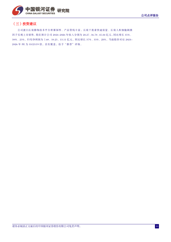 投资建议:公司蛋白长效修饰技术平台积累深厚、产品管线丰富,长效干扰素快速放量、长效人粒细胞刺激因子实现上市销售。我们预计公司2024-2026年收入分别为28.27、36.70、45.84亿元,同比增长35%、30%、25%,归母净利润为7.60、10.25、13.11亿元,同比增长37%、35%、28%,当前股价对应2024-2026年PE为33/25/19倍,首次覆盖,给予“推荐”评级。