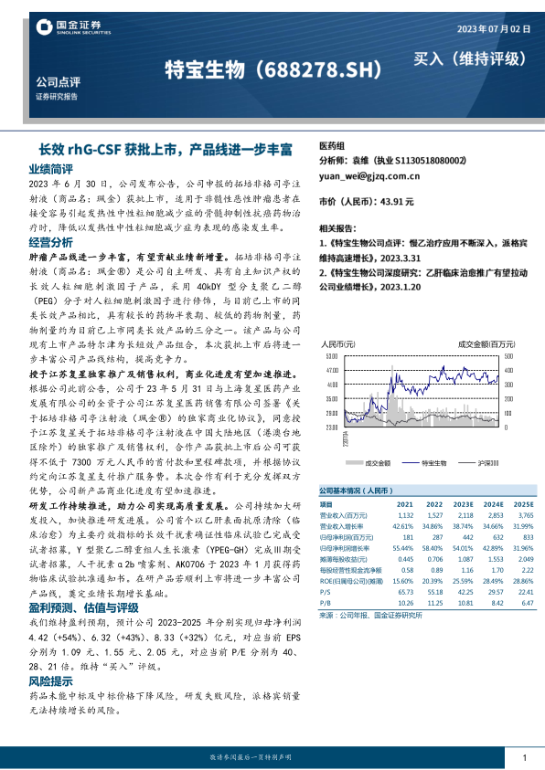 2023 年 6 月 30 日,公司发布公告,公司申报的拓培非格司亭注射液(商品名:珮金)获批上市, 适用于非髓性恶性肿瘤患者在接受容易引起发热性中性粒细胞减少症的骨髓抑制性抗癌药物治疗时,降低以发热性中性粒细胞减少症为表现的感染发生率。