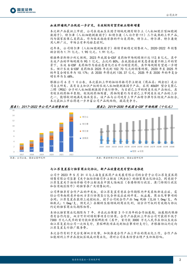 授予江苏复星独家推广及销售权利,商业化进度有望加速推进。根据公司此前公告,公司于 23 年 5 月 31 日与上海复星医药产业发展有限公司的全资子公司江苏复星医药销售有限公司签署《关于拓培非格司亭注射液(珮金®)的独家商业化协议》, 同意授予江苏复星关于拓培非格司亭注射液在中国大陆地区(港澳台地区除外)的独家推广及销售权利,合作产品获批上市后公司可获得不低于 7300 万元人民币的首付款和里程碑款项,并根据协议约定向江苏复星支付推广服务费。 本次合作有利于充分发挥双方优势,公司新产品商业化进度有望加速推进。