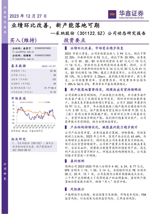 本报告的核心观点是采纳股份(301122.SZ)业绩环比改善,市场需求稳步恢复,同时新产能落地在即,有望持续释放规模效益。