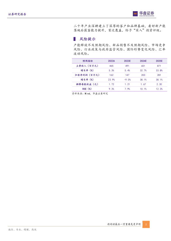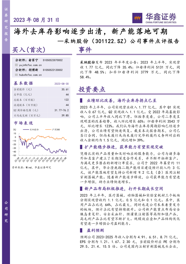 本报告分析了采纳股份2023年半年度业绩,指出公司业绩受海外去库存影响同比下滑,但二季度环比改善明显,预示拐点已至。公司扩产项目稳步推进,新产能落地有望提升获单能力,同时积极布局高附加值产品,优化产品结构,为长期成长奠定基础。首次覆盖,给予“买入”投资评级,并提示相关风险。