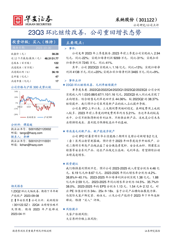 本报告分析了采纳股份(301122)2023年三季度业绩,指出公司业绩环比持续改善,重回增长态势,并维持“买入”评级。