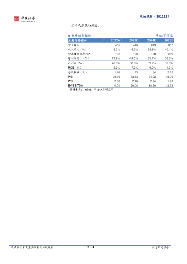 我们维持盈利预测不变,预计公司2023-2025收入有望分别为4.46亿元、6.19亿元和8.67亿元,2023-2025年同比增长率分别为-4.2%、38.8%和40.1%,2023-2025年归母净利润分别实现1.38亿元、1.88亿元和2.59亿元,2023-2025年同比增长率分别为-14.5%、35.7%和38.0%。2023-2025年的EPS分别为1.13元、1.54元和2.12元,对应PE估值分别为34x、25x和18x。鉴于公司产品横向拓展能力强,与国际大客户绑定紧、粘性大,以及公司产能将于2023年下半年逐渐释放,维持“买入”评级。