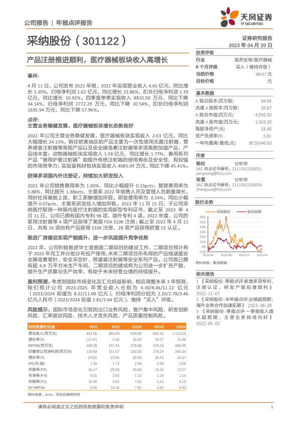 本报告对采纳股份(301122)2022年年报进行了分析,核心观点如下:
