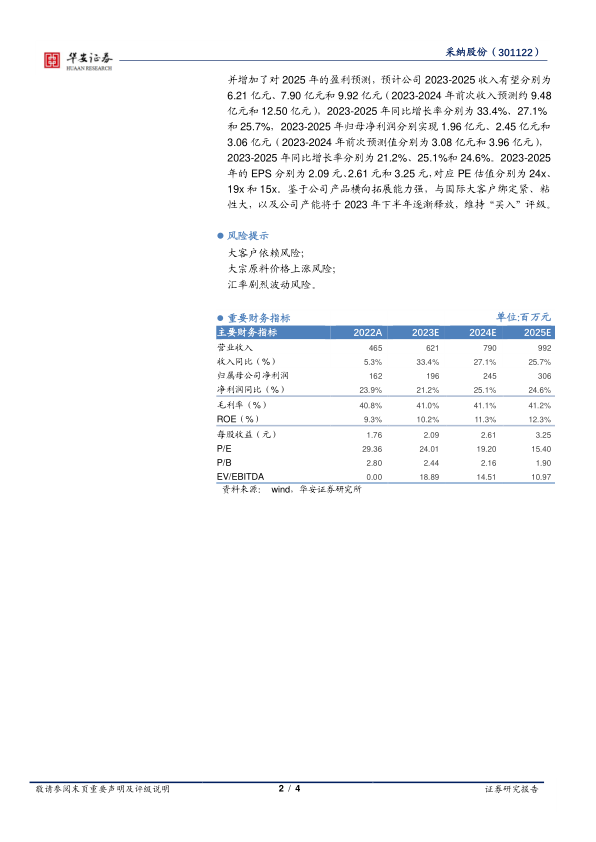 结合公司新发布的2022年年报,我们调整了2023-2024年盈利预测,并增加了对2025年的盈利预测,预计公司2023-2025收入有望分别为6.21亿元、7.90亿元和9.92亿元(2023-2024年前次收入预测约9.48亿元和12.50亿元),2023-2025年同比增长率分别为33.4%、27.1%和25.7%,2023-2025年归母净利润分别实现1.96亿元、2.45亿元和3.06亿元(2023-2024年前次预测值分别为3.08亿元和3.96亿元),2023-2025年同比增长率分别为21.2%、25.1%和24.6%。2023-2025年的EPS分别为2.09元、2.61元和3.25元,对应PE估值分别为24x、19x和15x。鉴于公司产品横向拓展能力强,与国际大客户绑定紧、粘性大,以及公司产能将于2023年下半年逐渐释放,维持“买入”评级。