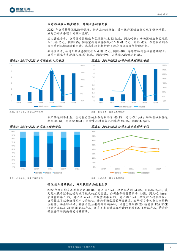 医疗器械板块稳步增长,外销业务持续发展。公司2022年医疗器械业务实现收入2.63亿元,同比+24%,成为公司业务增长的核心支撑;动物器械业务实现收入1.58亿元,同比+2%;实验室耗材业务实现收入0.41亿元,同比-45%。在动物系列与医用系列双轮驱动的同时,未来实验室耗材的下游应用领域有望持续扩大。