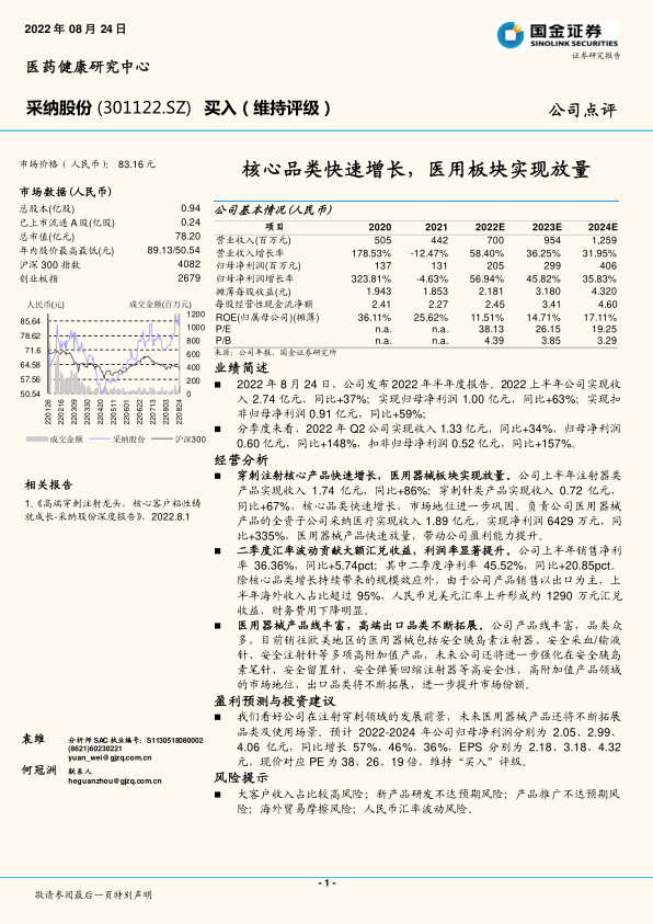 我们看好公司在注射穿刺领域的发展前景,未来医用器械产品还将不断拓展品类及使用场景。预计2022-2024年公司归母净利润分别为2.05、2.99、4.06亿元,同比增长57%、46%、36%,EPS分别为2.18、3.18、4.32元,现价对应PE为38、26、19倍,维持“买入”评级。