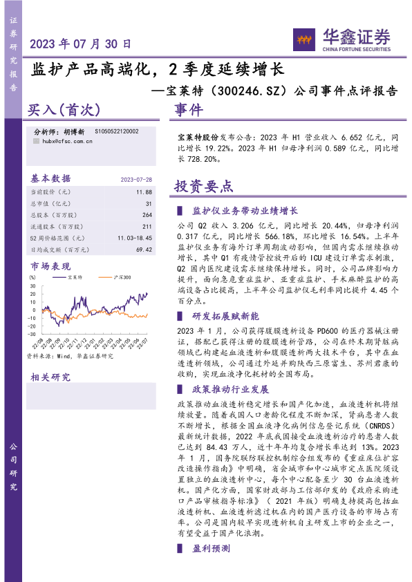 宝莱特2023年上半年业绩实现爆发式增长,主要得益于监护仪业务的高端化升级和国内医院建设需求的持续拉动。公司在血液净化领域通过研发创新和外延并购,构建了血液透析和腹膜透析两大技术平台,有望在人口老龄化加剧、肾病患者增多以及国家政策支持国产医疗设备的大背景下,迎来新的增长机遇。分析师首次覆盖并给予“买入”评级,预计未来几年公司营收和净利润将保持稳健增长,但需关注政策落地、新产品推广及海外订单波动等潜在风险。