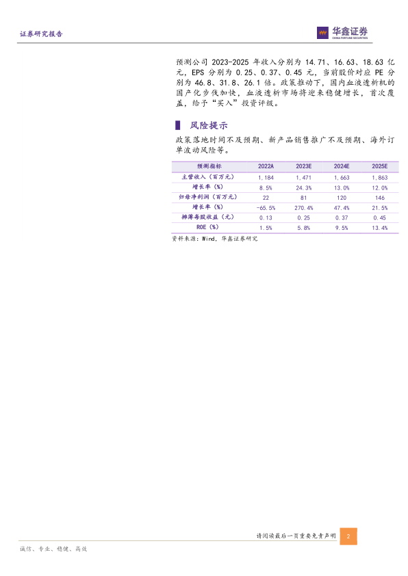 预测公司 2023-2025 年收入分别为 14.71、 16.63、 18.63 亿元, EPS 分别为 0.25、 0.37、 0.45 元,当前股价对应 PE 分别为 46.8、 31.8、 26.1 倍。政策推动下,国内血液透析机的国产化步伐加快, 血液透析市场将迎来稳健增长,首次覆盖, 给予“买入” 投资评级。