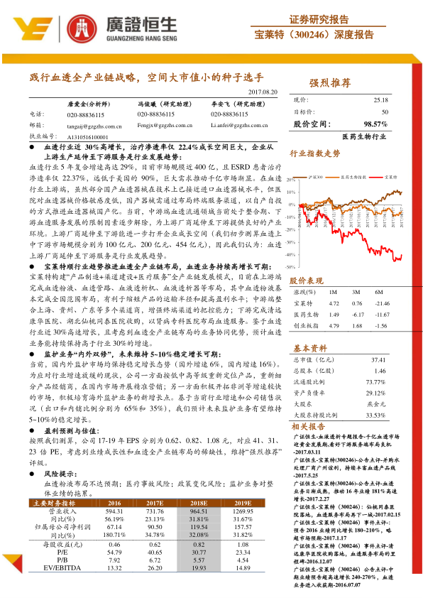 公司在血透业务高速发展的同时,其监护业务也通过“内外双修”策略保持稳定增长。监护业务通过产品精准营销和积极开拓海外市场,预计未来能维持5%至10%的稳定增长。血透与监护两大业务板块并驾齐驱,共同驱动公司业绩持续增长。报告预测宝莱特2017-2019年EPS分别为0.62、0.82、1.08元,对应PE分别为41、31、23倍,考虑到其业绩成长性和血透全产业链布局的稀缺性,维持“强烈推荐”评级,目标价50元,股价空间高达98.57%。