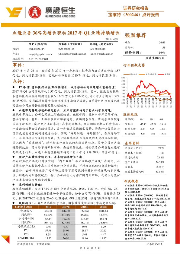 2017年Q1肾科医疗板块营收1.06亿元,同比增长35.92%,成为推动公司业绩增长的重要因素。公司深耕血透领域,布局初见成效。