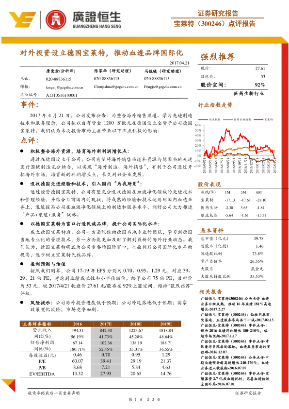 本次德国投资是宝莱特提升国际化水平、打造民族品牌的关键一步。公司将借此吸收德国在血液净化领域的先进技术和管理经验,并将其应用于国内业务,以迅速提高自身在血液净化领域的制造和服务水平,有力推进“产品+渠道+服务”战略。德国宝莱特将成为公司重要的国际窗口,全面助力公司国际化进程,逐步树立宝莱特民族品牌。