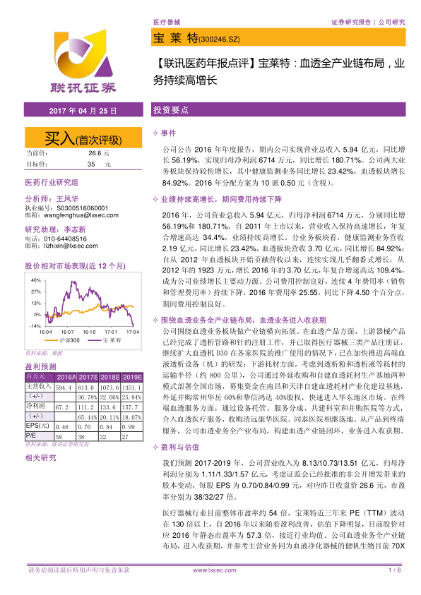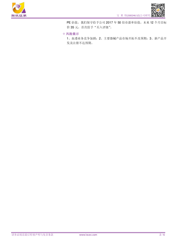 预测2017-2019年公司营业收入为8.13/10.73/13.51亿元,归母净利润分别为1.11/1.33/1.57亿元,每股EPS为0.70/0.84/0.99元,对应市盈率分别为38/32/27倍。参考主营业务同为血液净化器械的健帆生物目前70X PE估值,保守给予公司2017年50倍市盈率估值,未来12个月目标价35元,首次给予“买入评级”。