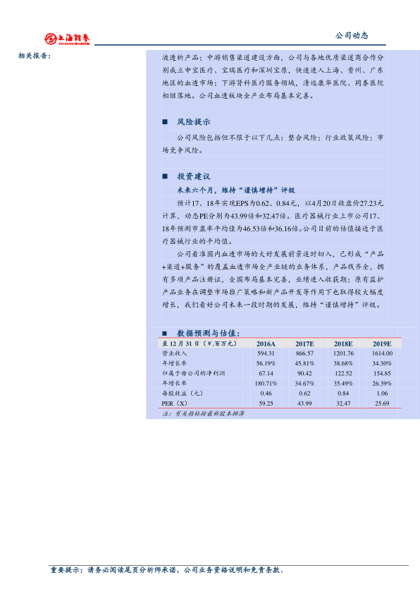 维持“谨慎增持”评级,主要基于公司在血透市场全产业链的业务体系和原有监护产品业务的增长。报告同时提示了整合风险、行业政策风险和市场竞争风险,并对公司未来盈利能力进行了预测。