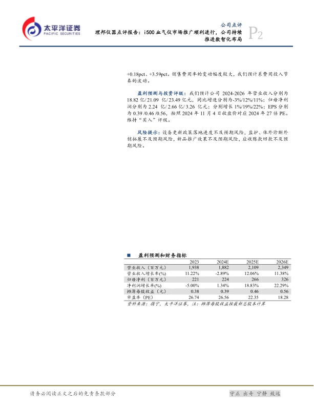 风险提示:设备更新政策落地进度不及预期风险,监护、体外诊断外销拓展不及预期风险,新品推广效果不及预期风险,应收账款回款不及预期风险。