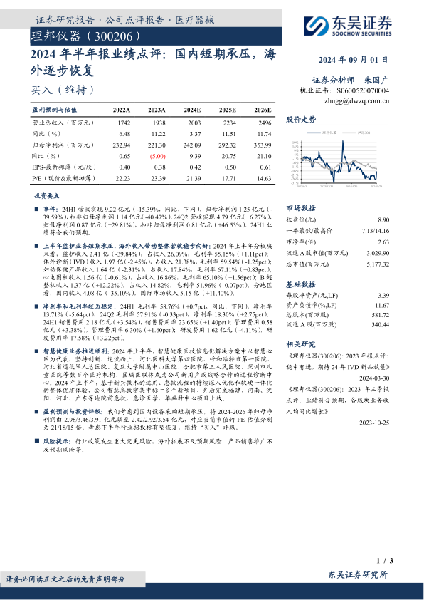 理邦仪器2024年上半年业绩受到国内市场短期承压的影响,但海外市场表现良好,带动整体营收稳步向好。公司各业务板块发展不均衡,但智慧健康业务进展顺利。报告下调了盈利预测,但维持“买入”评级,并提示了相关风险。