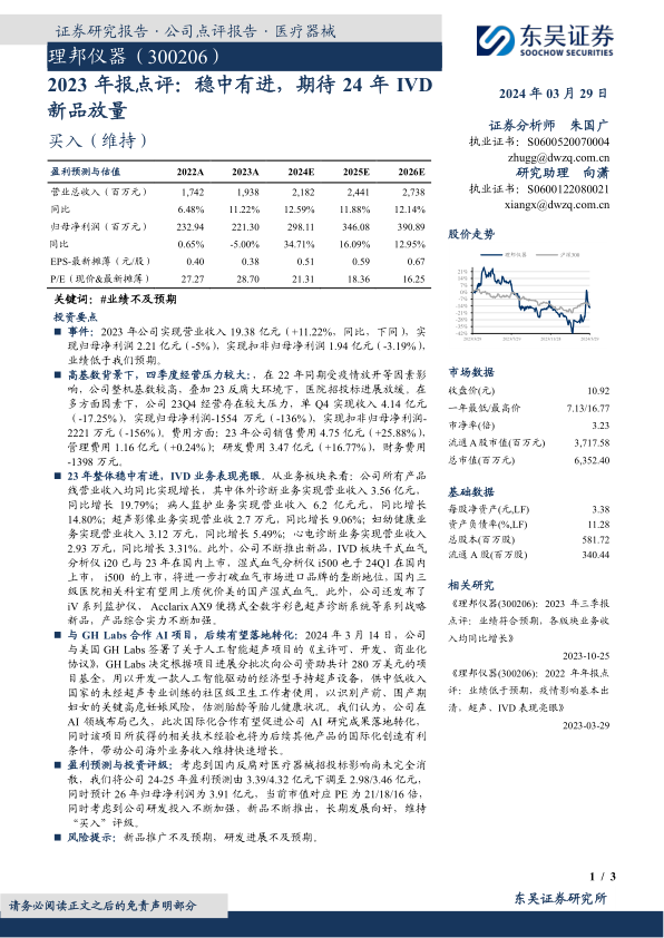 理邦仪器2023年报显示公司整体经营稳健,各业务板块均实现增长,尤其IVD业务表现突出。虽然四季度面临一定经营压力,但新品的不断推出和AI领域的国际合作,为公司未来的发展奠定了良好基础。