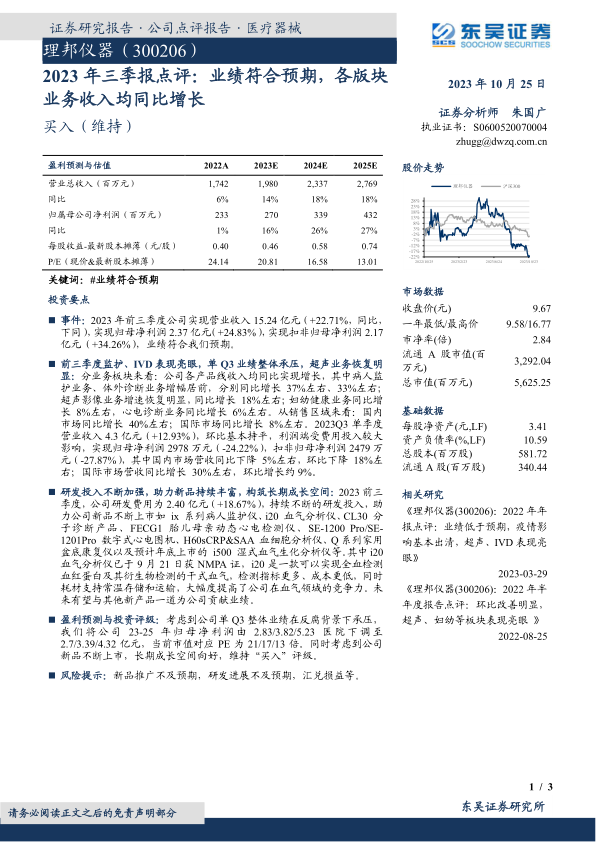 本报告对理邦仪器2023年三季报进行了全面分析,指出公司业绩符合预期,各业务板块均实现增长,研发投入不断加强,新品陆续上市,长期成长空间向好。尽管短期内业绩受到一些因素的影响,但维持对公司的“买入”评级。