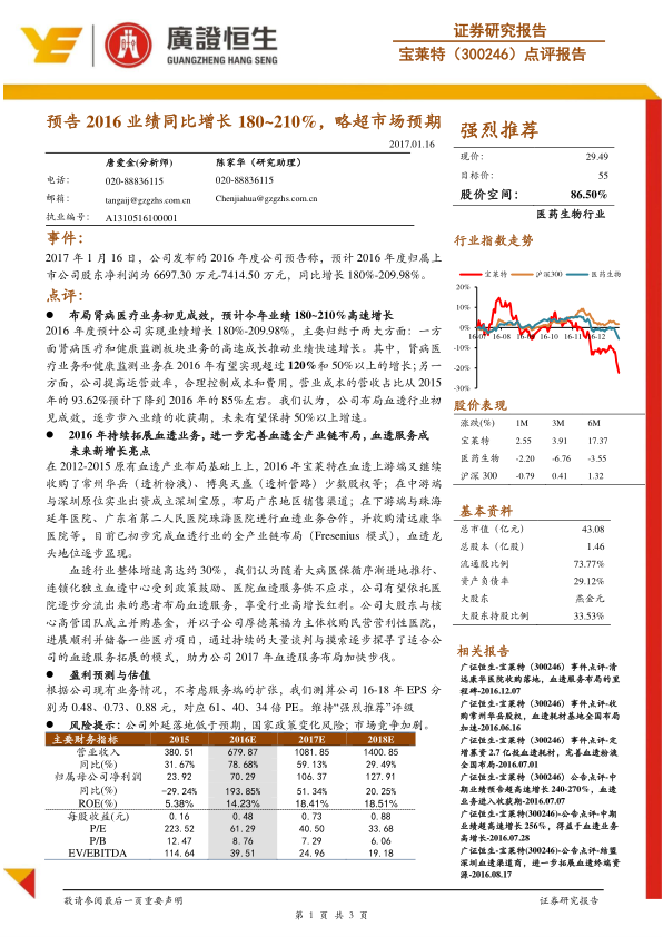 宝莱特2016年业绩实现180%-210%的高速增长,主要得益于肾病医疗和健康监测业务的强劲表现以及运营效率的提升。公司通过收购和合作,已初步完成血透全产业链布局,有望在血透行业30%的整体增速背景下,凭借政策红利和市场需求,将血透服务打造为未来新的增长亮点。分析师维持“强烈推荐”评级,并预测未来几年公司业绩将持续增长,但同时提示了外延落地、政策变化和市场竞争等风险。
