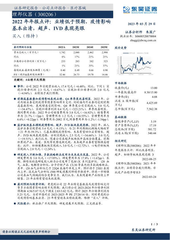 理邦仪器2022年业绩受到疫情和高基数的影响,低于预期。但公司在超声、IVD等板块表现突出,研发投入持续增加,并推出多款战略新品,为未来发展奠定了基础。随着疫情影响的消退,公司有望在2023年迎来业绩的恢复和增长。尽管报告下调了盈利预期,但维持了“买入”评级,表明对公司长期发展前景的信心。投资者应关注新品推广、研发进展以及汇兑损益等风险因素。