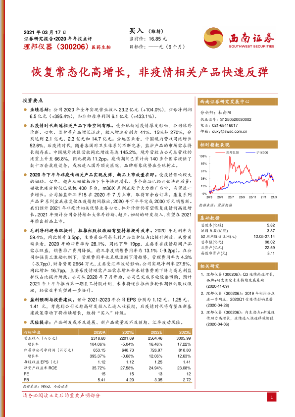 理邦仪器2020年业绩大幅增长,主要受益于新冠疫情带来的相关产品需求激增。同时,公司非疫情相关业务也实现了快速反弹,新品上市和研发投入有望驱动未来增长。公司盈利能力提升,费用控制有效,并计划推出股权激励,有望进一步提升经营效率。综合来看,理邦仪器具备长期增长潜力,维持“买入”评级。
