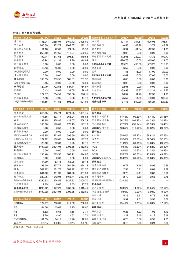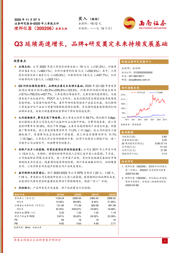 本报告通过对理邦仪器2020年三季报的详细分析,认为公司在疫情期间受益于海外市场需求和品牌效应,实现了业绩的高速增长。同时,公司盈利能力提升,费用控制有效,长期研发投入逐步进入收获期,为未来增长奠定了基础。维持“买入”评级,但需关注产品研发和新产品放量不及预期的风险。