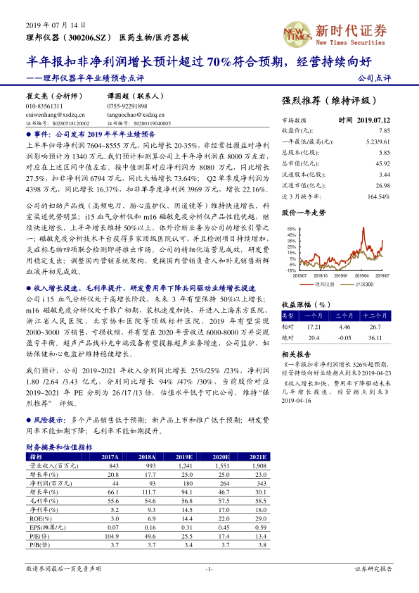 理邦仪器2019年上半年业绩表现亮眼,扣非净利润预计同比增长超过70%,远超市场预期,显示出公司经营持续向好。这一增长主要得益于妇幼产品线、i15血气分析仪和m16磁敏免疫分析仪等核心产品的快速增长,以及精细化运营和营销系统优化带来的效率提升。展望未来,公司核心产品市场潜力巨大,预计将持续贡献高增长,同时整体盈利能力和资本回报率也将显著提升。尽管存在产品销售、新产品推广及费用控制等风险,但基于对公司未来收入和净利润的乐观预测,新时代证券维持“强烈推荐”评级,认为公司当前估值具备吸引力。