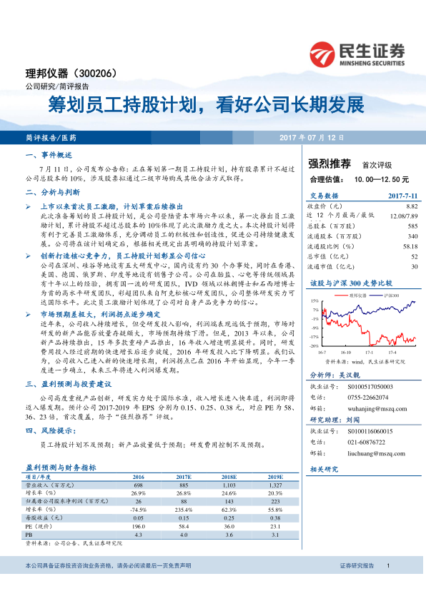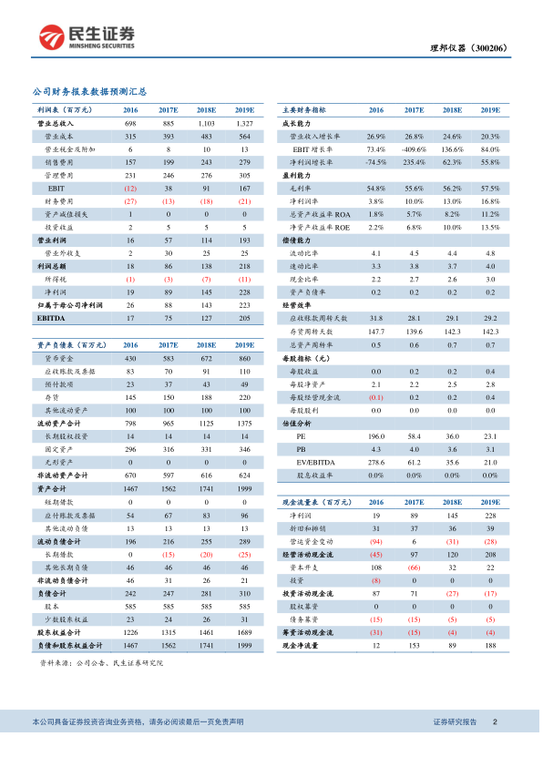 基于对公司创新能力和盈利能力的看好,本报告给予理邦仪器“强烈推荐”评级,并预测公司2017-2019年EPS分别为0.15元、0.25元、0.38元。