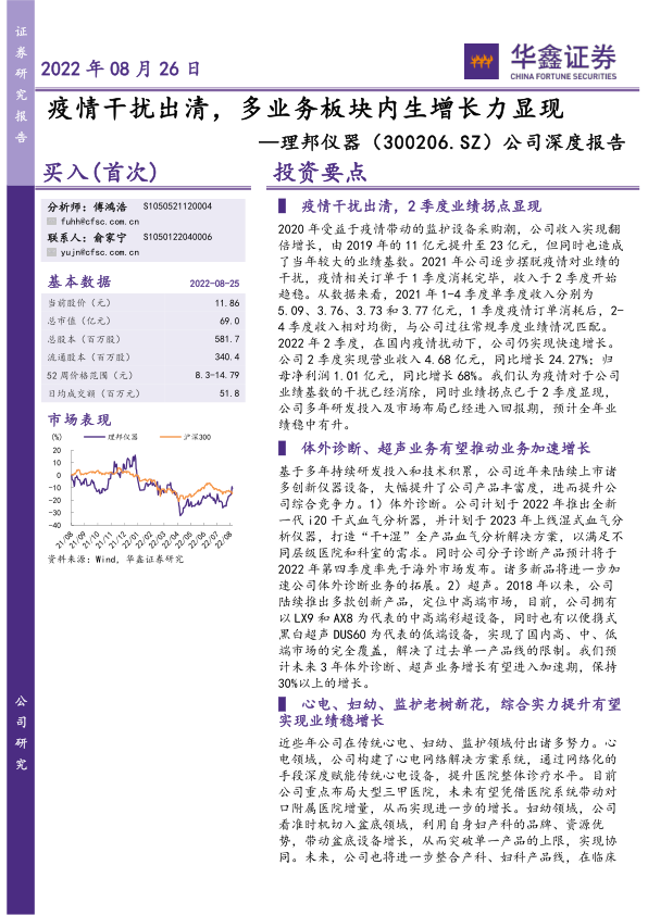 理邦仪器作为国产医疗设备领域的领军企业,在经历疫情带来的短期业绩波动后,已于2022年第二季度展现出明确的业绩拐点。公司多年来在研发上的持续投入和市场布局正逐步进入收获期,体外诊断和超声业务有望进入高速增长阶段,而心电、妇幼、监护等传统优势业务也通过创新升级焕发新活力,并辅以智慧医疗的战略布局实现多板块协同。报告预计公司未来三年收入和归母净利润将保持高速增长,并基于PEG-1方法给予“买入”投资评级,认为其具备显著的投资价值。同时,报告也提示了新品推广不及预期和疫情反复可能带来的经营风险。