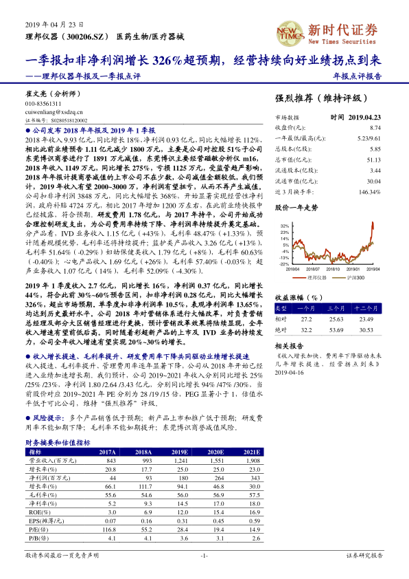 理邦仪器在2018年年报及2019年一季报中展现出强劲的业绩增长,特别是扣非净利润的大幅提升,表明公司经营已步入良性循环,业绩拐点明确。通过成功的营销改革、研发费用控制以及产品结构优化,公司收入增长提速,盈利能力显著增强。展望未来,随着新产品的上市和IVD业务的持续发力,公司有望保持高速增长,且当前估值水平具备吸引力。尽管存在产品销售、新产品推广、费用控制及毛利率提升等方面的风险,但整体而言,理邦仪器具备显著的投资价值,维持“强烈推荐”评级。
