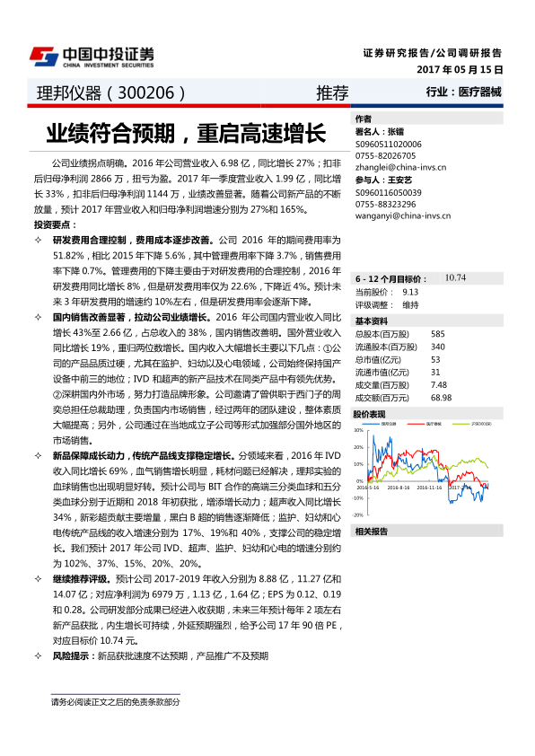 本报告认为理邦仪器业绩拐点明确,通过有效的费用控制、国内外市场的拓展以及新品的不断推出,公司未来几年有望保持高速增长。维持推荐评级,目标价10.74元。但需注意新品获批速度和产品推广不及预期的风险。