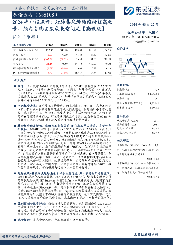 赛诺医疗2024年中报表现亮眼,营收和利润均实现显著增长。冠脉集采续约维持较高放量,颅内自膨支架等创新产品有望驱动未来增长。公司在神经介入和冠脉介入领域均有布局,海外市场拓展也取得积极进展。维持“买入”评级,但需关注集采降价和产品获批时间等风险。