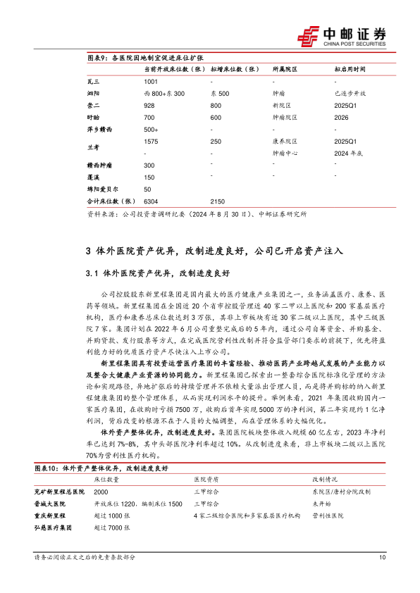 公司控股股东新里程集团在全国近20个省市控股管理近40家二甲以上医院和200家基层医疗机构,医疗和康养总床位数达到3万张。集团计划在2022年6月公司重整完成后的5年内,优先将盈利能力好的优质医疗资产尽快注入上市公司。集团医院板块收入规模60亿左右,2023年净利率已达到7%-8%,其中头部医院净利率超过10%从改制进度来看,非上市板块二级以上医院70%为营利性医疗机构。