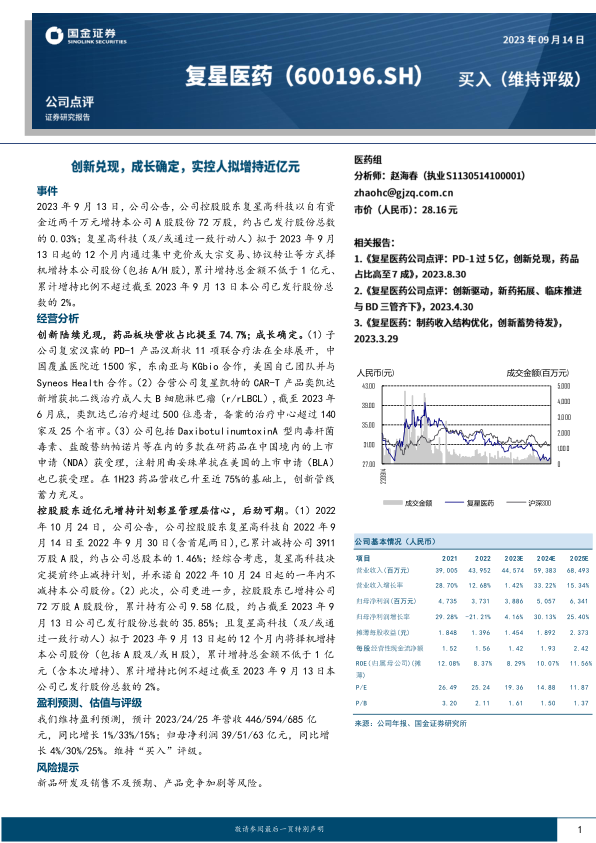 控股股东近亿元增持计划彰显管理层信心,后劲可期。(1) 2022年 10 月 24 日,公司公告,公司控股股东复星高科技自 2022 年 9月 14 日至 2022 年 9 月 30 日(含首尾两日), 已累计减持公司 3911万股 A 股,约占公司总股本的 1.46%; 经综合考虑,复星高科技决定提前终止减持计划,并承诺自 2022 年 10 月 24 日起的一年内不减持本公司股份。(2)此次,公司更进一步,控股股东已增持公司72 万股 A 股股份,累计持有公司 9.58 亿股,约占截至 2023 年 9月 13 日公司已发行股份总数的 35.85%;且复星高科技(及/或通过一致行动人)拟于 2023 年 9 月 13 日起的 12 个月内将择机增持本公司股份(包括 A 股及/或 H 股),累计增持总金额不低于 1 亿元(含本次增持)、累计增持比例不超过截至 2023 年 9 月 13 日本公司已发行股份总数的 2%。
