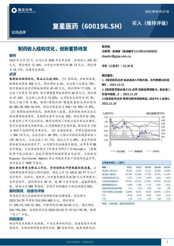 复星医药2022年业绩表现稳健,实现收入439.52亿元,同比增长12.66%;扣非后归母净利润38.73亿元,同比增长18.17%,符合市场预期。公司制药板块结构持续优化,创新药及次新品收入占比超30%,成为核心增长动力。同时,医疗器械与医学诊断、医疗健康服务板块亦实现显著增长,展现公司多元化业务布局的韧性与潜力。公司持续加大研发投入,创新管线进展积极,FIC(First-in-Class)与BIC(Best-in-Class)产品比例高,为未来业绩增长奠定基础。国际化战略稳步推进,海外收入贡献提升,并通过BD(Business Development)合作拓展全球市场。市场对公司未来业绩持乐观态度,维持“买入”评级,预计创新药将持续贡献业绩增量。