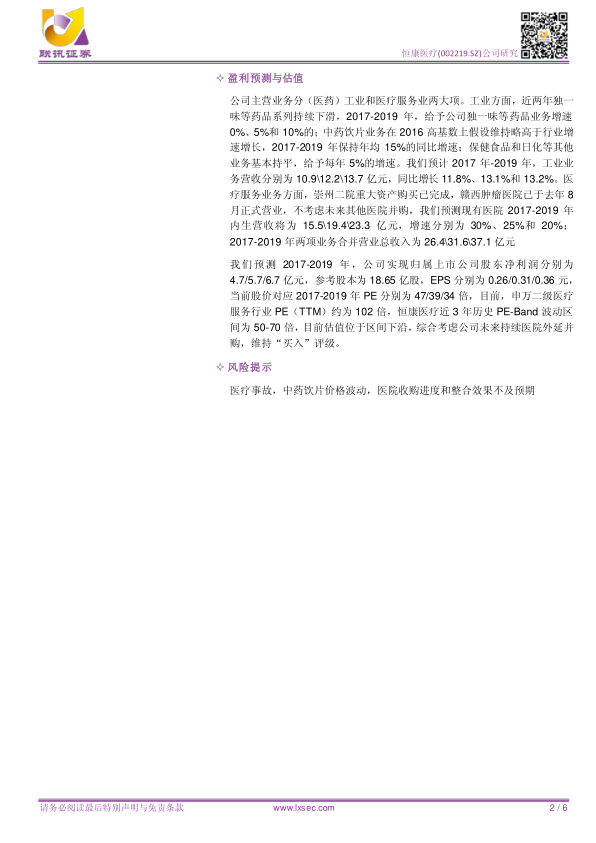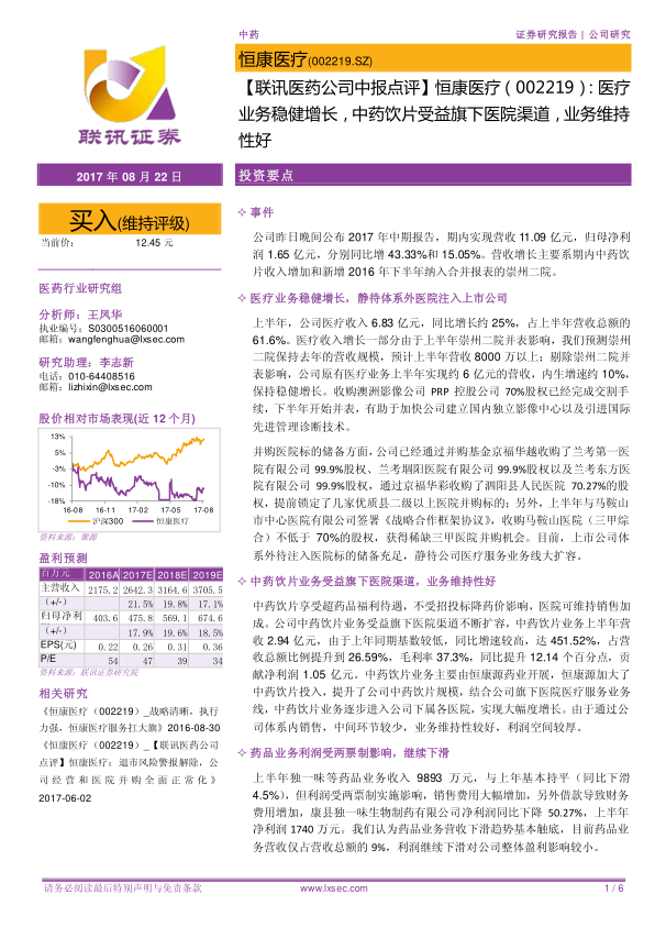 本报告分析了恒康医疗2017年中期报告,指出公司医疗业务稳健增长,中药饮片业务受益于医院渠道,药品业务营收下滑趋势触底。 报告预测了公司未来几年的营收和利润,并维持“买入”评级,同时也提示了相关风险。总体而言,恒康医疗在医疗服务和中药饮片领域具有较强的竞争优势,未来发展潜力可期。
