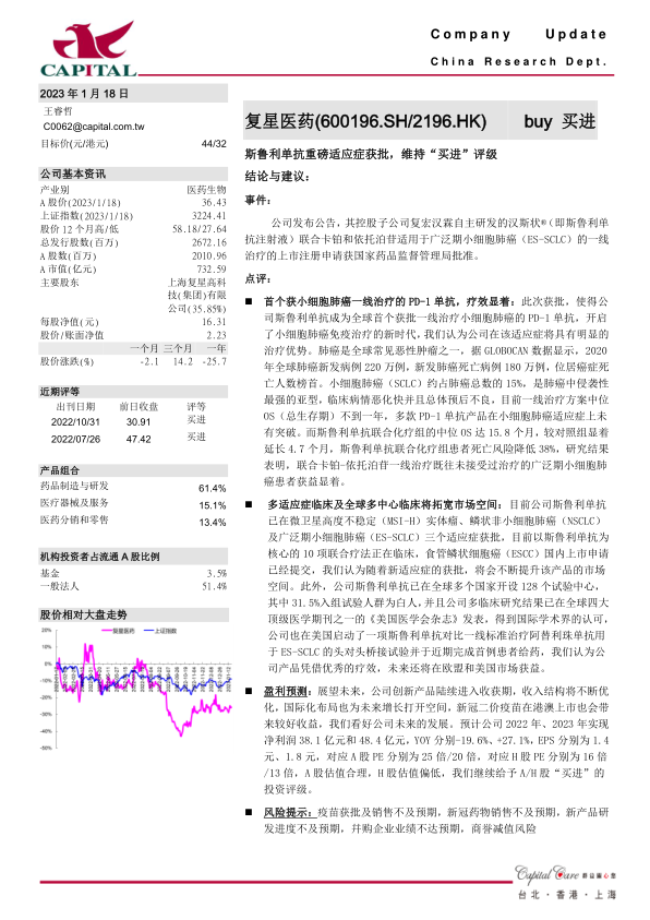 复星医药的斯鲁利单抗获批小细胞肺癌一线治疗,具有显著的临床优势和市场潜力。公司创新产品进入收获期,国际化布局打开增长空间,未来发展值得期待。维持A/H股“买进”的投资评级,但需关注疫苗和新冠药物销售、新产品研发进度、并购企业业绩以及商誉减值等风险。