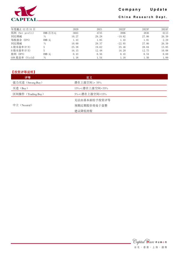 盈利预测:展望未来,公司创新产品陆续进入收获期,收入结构将不断优化,国际化布局也为未来增长打开空间,新冠二价疫苗在港澳上市也会带来较好收益,我们看好公司未来的发展。预计公司2022年、2023年实现净利润38.1亿元和48.4亿元,YOY分别-19.6%、+27.1%,EPS分别为1.4元、1.8元,对应A股PE分别为25倍/20倍,对应H股PE分别为16倍/13倍,A股估值合理,H股估值偏低,我们继续给予A/H股“买进”的投资评级。