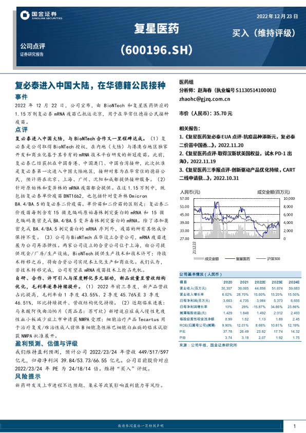 复星医药在2022年末通过复必泰mRNA疫苗首次进入中国大陆市场,为在华德籍公民提供接种服务,标志着其与BioNTech的合作迈入新阶段。此次合作不仅拓展了疫苗市场,更通过合资公司布局本土化生产,有望使复星医药在mRNA技术领域占据先机。公司在2022年前三季度通过新产品放量和营收结构优化,实现了毛利率的持续提升,展现出稳健的盈利能力。同时,其丰富的产品管线和积极的研发进展,为未来的持续增长提供了坚实基础。尽管面临新药研发和政策风险,但基于国金证券研究所的财务预测,公司营收和归母净利润预计将持续增长,估值合理,维持“买入”评级,整体展望积极。